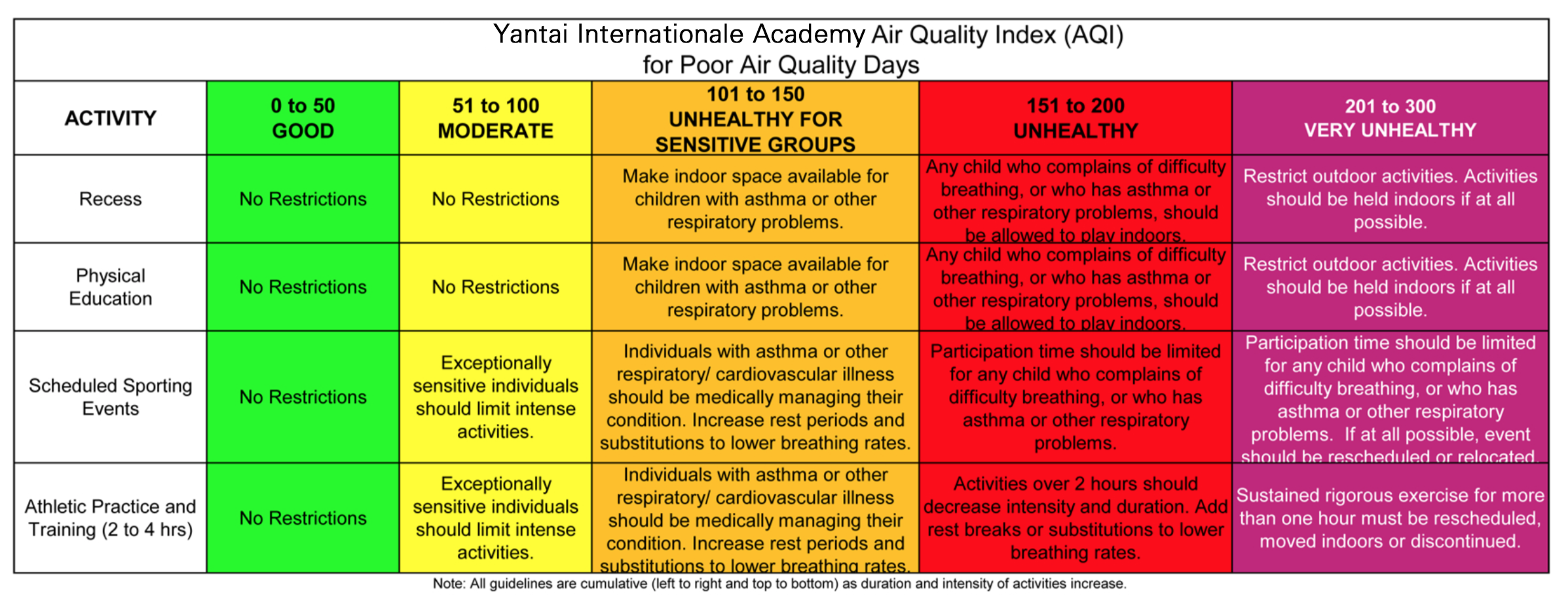 This policy applies to outdoor sports as well as outdoor playtime. A summary of our AQI (Air Quality Index) policy: